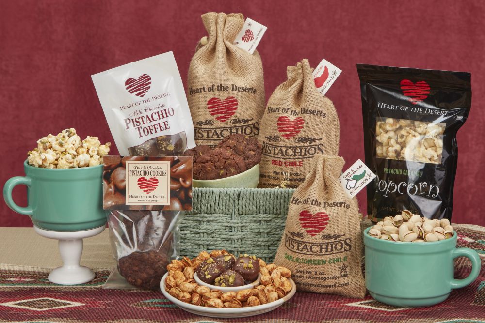 Our beatiful Autumn Sage basket is overflowing with tasty treats. From crunchy popcorn to buttery toffee and savory pistachios, this basket has something for everyone. Enjoy the crisp fall weather, settle in by the fire and let the good times begin. Autumn Sage Basket Contains: 1 lb Salted & Roasted Pistachios in Burlap 1/2 lb Red Chile Flavored Pistachios in Burlap 1/2 lb Garlic & Green Chile Flavored Pistachios in Burlap 6 oz Pistachio Caramel Popcorn 4 oz Double Chocolate Pistachio Cookies 3 oz Milk Chocolate Pistachio Toffee
