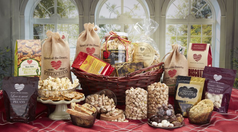 We've been growing pistachios for over 50 years now. We've learned with the right amount of care, the desert will yield a delicious bounty. This handsome basket is packed full of amazing treats featuring a fabulous array of delicious products created with our farm fresh pistachios. Grab some friends and join us in celebrating the bounty of the desert! Desert Bounty Basket Contains: 2 lb Salted & Roasted Pistachios in Burlap 1 lb Garlic & Green Chile Flavored Pistachios in Burlap 1 lb Garlic & Onion Flavored Pistachios in Burlap 24 oz Pistachio Caramel Popcorn 1 Dozen White Chocolate Chunk Pistachio Cookies 7 oz Cappuccino Almonds 8 oz Milk Chocolate Pistachio Toffee 4 oz Pistachio Cranberry Biscotti 8 oz Yogurt Covered Pecans 8 oz Dark Chocolate Covered Pecans 7 oz Green Chile Pistachio Brittle 8 oz Pistachio Coffee