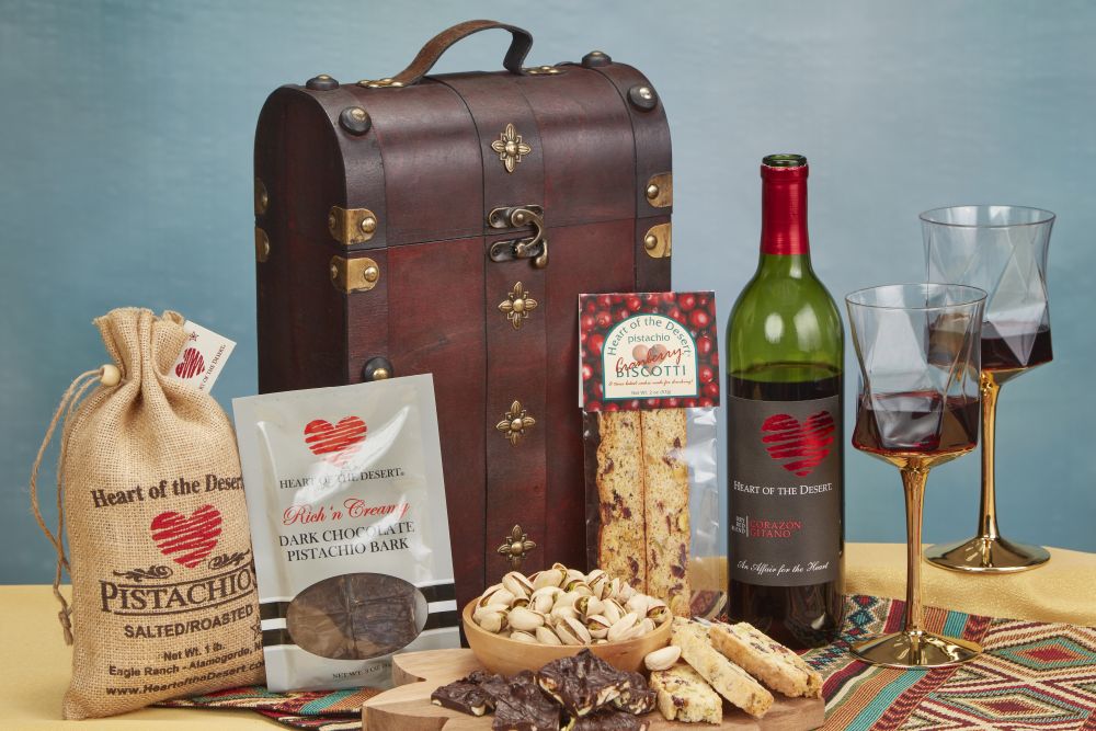 Nothing but the best for you! Celebrate the season with your favorite Heart of the Desert wine. We’ve tucked a bottle into a decorative box, and added some delicious pistachios and decadent sweets. We hope you’ll share these tasty treasures with someone you love! Only the Finest Box Contains: 1 lb Salted & Roasted Pistachios in Burlap 3 oz Dark Chocolate Pistachio Bark 2 oz Pistachio Cranberry Biscotti Plus the cost of your choice of Heart of the Desert Wine