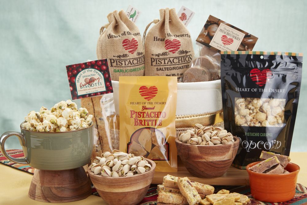 Spirit of the Southwest Basket Contains: ½ lb Salted & Roasted Pistachios in Burlap ½ lb Garlic & Green Chile Flavored Pistachios in Burlap 3 oz Pistachio Brittle 6 oz Pistachio Caramel Popcorn 2 oz Pistachio Cranberry Biscotti 4 oz Double Chocolate Pistachio Cookies