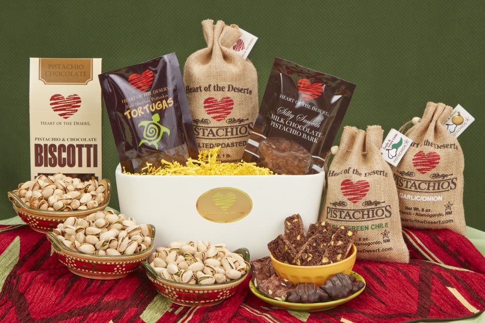 This beautiful basket embraces all that the farm has to offer. There are plenty of delicious treats to share with family and friends. Our White Gold basket brings the best of a bountiful harvest to your table. The White Gold Basket Contains: 1 lb Salted & Roasted Pistachios in Burlap ½ lb Garlic & Green Chile Flavored Pistachios in Burlap ½ lb Garlic & Onion Flavored Pistachios in Burlap 4 oz Pistachio Chocolate Biscotti 3 oz Dark Chocolate Pistachio Tortugas 3 oz Milk Chocolate Pistachio Bark